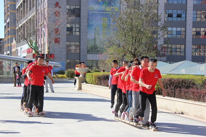 “齊心協(xié)力”項(xiàng)目比的就是大家的一致性,各代表隊(duì)派出一組選手,每組六名運(yùn)動(dòng)員,分別站在兩塊木板上,用繩固定腳與木板,雙手扶肩,一起向終點(diǎn)前進(jìn),兩隊(duì)一組,計(jì)時(shí)比賽。最終萬(wàn)豪酒店以0.16秒是優(yōu)勢(shì)險(xiǎn)勝天運(yùn)(嘉晨)公司,取得第一名。