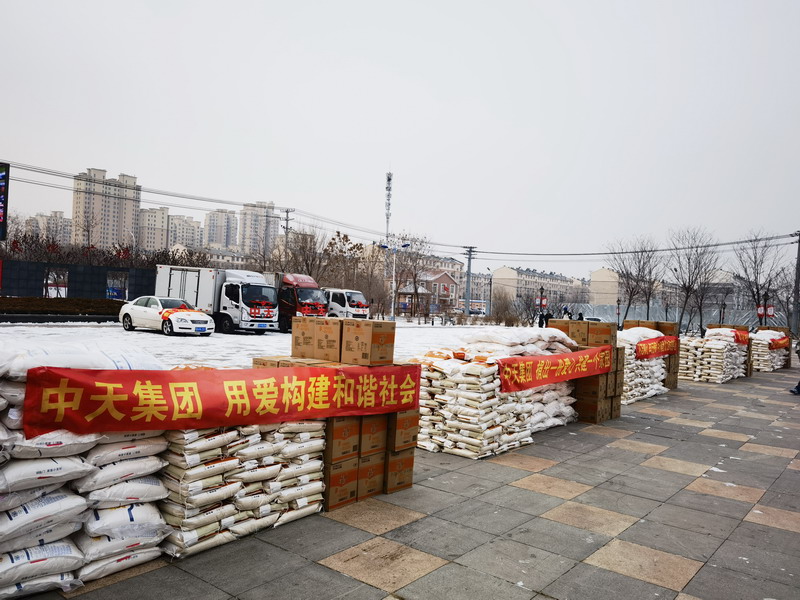 歲末寒冬迎春節(jié),真情慰問暖人心。2021年2月3日,在集團(tuán)于寶權(quán)董事長的帶領(lǐng)下,滿載大米、面粉和豆油的五輛大卡車,直赴營口市西市區(qū)得勝街道紅運社區(qū)廣場,在這里即將舉行中天集團(tuán)扶貧物質(zhì)發(fā)放儀式,在新年來臨之際,為營口市區(qū)西部的600戶貧困居民每戶發(fā)放一袋大米、一袋面粉和一桶豆油。這已經(jīng)是中天集團(tuán)自2010年起連續(xù)十二年舉辦該活動,為的就是讓這些貧困家庭能夠過上一個快樂祥和的新年。