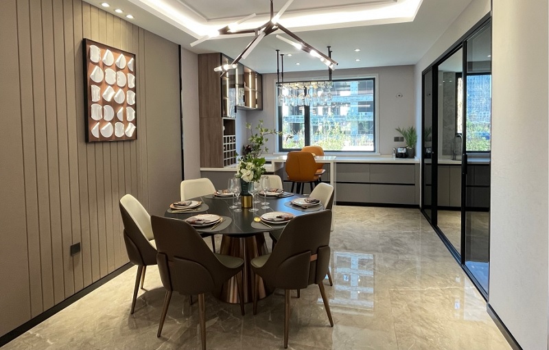 公區(qū)空間開放設(shè)計貫穿始終,從視覺和使用體驗上,滿足改善型家庭對照顧家人、招待親友的多場景要求。廚房與餐廳之間形成一體,無需再來回走動,縮短了家務(wù)動線,且打通之后彼此沒有間隔,即使是在客廳,也能與廚房里的家人進行互動。同時去掉墻體占用的面積,不僅是視覺上變大了,整體使用空間也變大了,以此為基礎(chǔ)增加收納、櫥柜、桌面等設(shè)計,能在空間上實現(xiàn)最大化利用。
