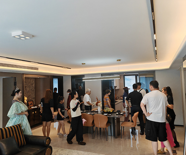 儀式現(xiàn)場,熱情高漲的客戶早已匯聚于這座流光溢彩的東大門前。以名貴理石精工筑就、星空頂熠熠生輝、水幕墻靈動瀉玉、噴泉水系恭迎貴賓的“星幕尊邸門”,其本身即是歸家尊崇儀式的開篇序章,成為令人矚目的視覺地標(biāo)。人群中,既有開盤即購房的業(yè)主,滿懷憧憬前來借鑒設(shè)計靈感,為未來愛家描繪藍(lán)圖;亦有眾多意向濃厚的準(zhǔn)業(yè)主,翹首以盼親身體驗升級品質(zhì),為理想生活尋覓最契合的空間載體。
