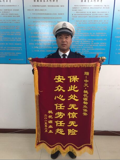 日前,業(yè)主為了感謝周班長等保安這種負責(zé)精神,特意制作了一面錦旗,上書:“保此處無驚無險,安眾心任勞任怨?!狈Q贊桃花源物業(yè)人員的高尚品德。高品質(zhì)服務(wù),送來錦旗一面,醒目的兩行字這是對我物業(yè)的工作給予的高度的肯定。