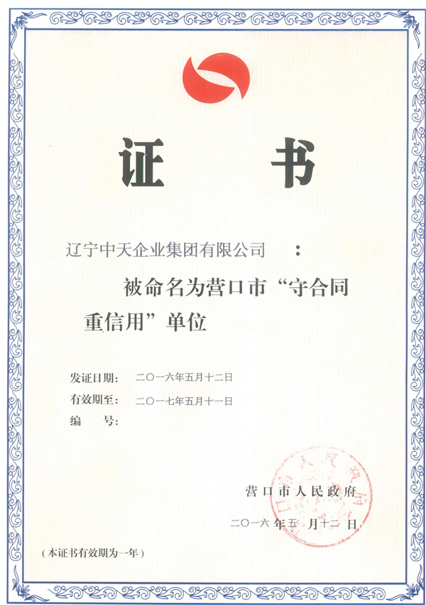 10、集團(tuán)連續(xù)12載榮獲“守合同重信用”單位稱號。2016年中天集團(tuán)再次被營口市人民政府授予“守合同重信用”單位稱號,連續(xù)12年獲此殊榮,不僅是全體員工多年勤奮工作、共同努力的結(jié)果,更是集團(tuán)恪守誠信、規(guī)范經(jīng)營的有力印證,也是對中天優(yōu)秀品牌信譽(yù)建設(shè)成果的充分肯定。