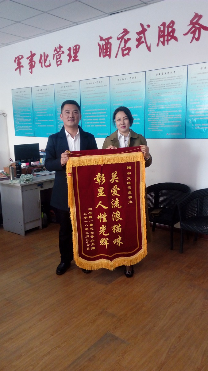 3月26日上午,桃花源小區(qū)4號(hào)樓業(yè)主送來(lái)一面錦旗,上面寫著“關(guān)愛流浪貓咪,彰顯人性光輝”。原來(lái)這位業(yè)主非常關(guān)愛小區(qū)流浪貓,她自費(fèi)購(gòu)買貓糧,在地下室角落每天投放。而我們的物業(yè)保潔不僅沒有驅(qū)逐流浪貓,還主動(dòng)幫助打掃喂食的地方,這份善意讓業(yè)主感動(dòng)。