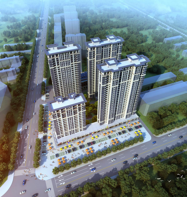 該地塊用地性質為居住用地、商業(yè)服務業(yè)設施用地,用地面積:42490.9平方米,總建筑面積:91297.45平方米,其中住宅建筑面積為69489.92平方米,商業(yè)建筑面積為6810.74平方米。南北兩排住宅建筑與沿街商業(yè)圍合形成中心景觀區(qū)域,既滿足用戶需要又提升商業(yè)價值。另外還設計了物業(yè)配套建筑和文化活動中心,物業(yè)建筑面積為300平方米,不僅為用戶提供了更加方便快捷的服務,還為用戶配備了舒適的休閑娛樂活動區(qū);小區(qū)道路等級分明,功能明確,沿街設置三個入口以及一個地下車庫入口,小區(qū)道路寬6米,機動車位共665個,其中地上停車位293個,地下停車位372個,為業(yè)主提供了足夠的停車空間;小區(qū)綠化率達到30%,讓業(yè)主置身園林體會“曲徑通幽處”、“小橋流水人家”的意境。