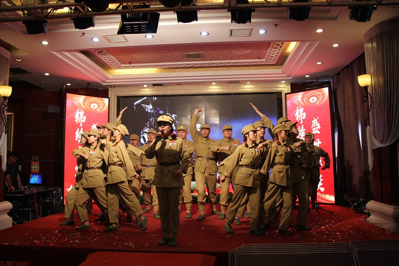 集團總部機關代表隊當《沒有共產黨就沒有新中國》的旋律響起,當巨型的國旗升起,贏得了熱情的掌聲。一首《眾人劃槳開大船》,唱出了特有的氣勢。特別是于寶權董事長和于洪波總經理登臺演唱,把演唱推向了高潮。萬豪酒店代表隊表演的《紅色娘子軍》,在馮國總經理的指揮下,非常有氣勢,具有很高的感染力。