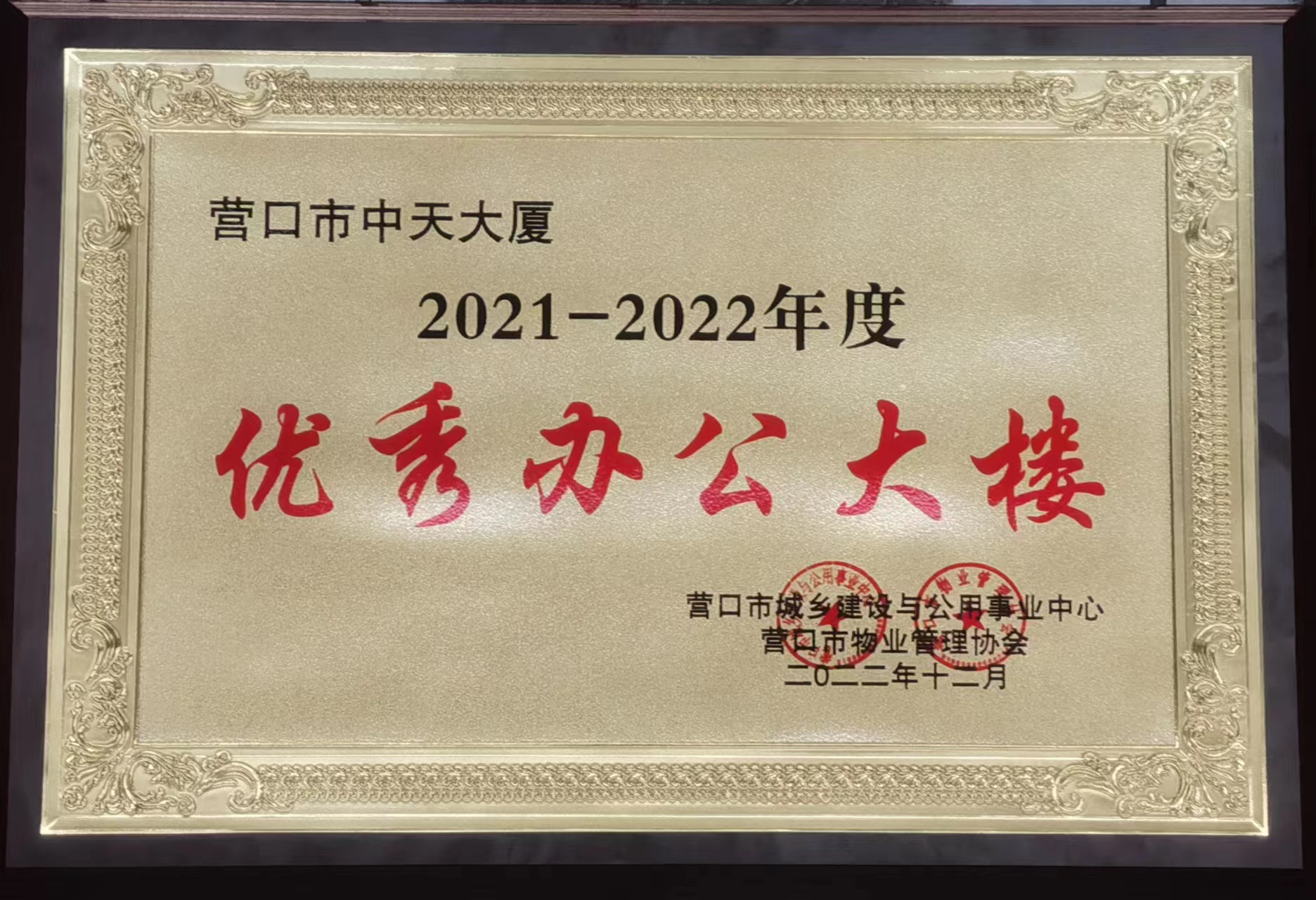3月9日下午,營(yíng)口市城鄉(xiāng)建設(shè)與公用事業(yè)中心和營(yíng)口市物業(yè)管理協(xié)會(huì),在財(cái)富酒店召開(kāi)“2021-2022年度營(yíng)口市優(yōu)秀物業(yè)服務(wù)項(xiàng)目、優(yōu)秀服務(wù)人員評(píng)選活動(dòng)”頒獎(jiǎng)典禮。中天大廈在全市各機(jī)關(guān)企事業(yè)辦公大樓中,與其它17家單位共同獲得“優(yōu)秀辦公大樓”稱號(hào),項(xiàng)目經(jīng)理趙瑩代表上臺(tái)領(lǐng)獎(jiǎng)。