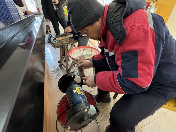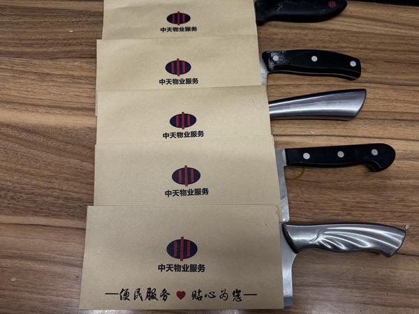 寒冷的天氣也阻擋不住業(yè)主們參加活動(dòng)的熱情,他們拿出家里的菜刀、砍刀、剔骨刀、剪刀、西餐刀……等各式刀具來到服務(wù)中心的便民服務(wù)點(diǎn)排隊(duì)磨刀。在磨刀等候的閑暇之余業(yè)主們還可以嘮著家常,拉近了彼此之間的距離。物業(yè)工作人員為業(yè)主的每把刀具上貼好樓號房號,做好登記。