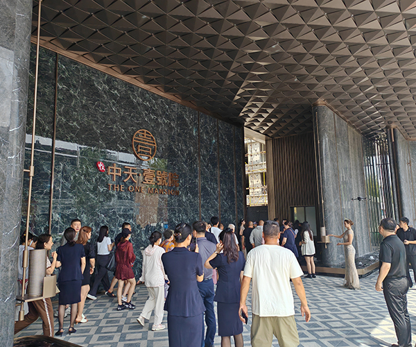 儀式現(xiàn)場,熱情高漲的客戶早已匯聚于這座流光溢彩的東大門前。以名貴理石精工筑就、星空頂熠熠生輝、水幕墻靈動瀉玉、噴泉水系恭迎貴賓的“星幕尊邸門”,其本身即是歸家尊崇儀式的開篇序章,成為令人矚目的視覺地標(biāo)。人群中,既有開盤即購房的業(yè)主,滿懷憧憬前來借鑒設(shè)計靈感,為未來愛家描繪藍(lán)圖;亦有眾多意向濃厚的準(zhǔn)業(yè)主,翹首以盼親身體驗升級品質(zhì),為理想生活尋覓最契合的空間載體。