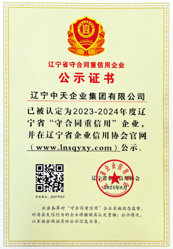 近日,中天集團(tuán)憑借卓越的商業(yè)信譽(yù)和嚴(yán)謹(jǐn)?shù)穆募s能力,被遼寧省企業(yè)信用協(xié)會(huì)認(rèn)定為2023-2024年度遼寧省“守合同重信用”企業(yè)和信用等級(jí)5A級(jí)企業(yè),這是集團(tuán)自2005年以來(lái)連續(xù)20年獲此殊榮。這一榮譽(yù)不僅是對(duì)集團(tuán)長(zhǎng)期以來(lái)堅(jiān)持誠(chéng)信經(jīng)營(yíng)的高度認(rèn)可,更是對(duì)企業(yè)在打造品牌、服務(wù)社會(huì)方面不懈追求的充分肯定。