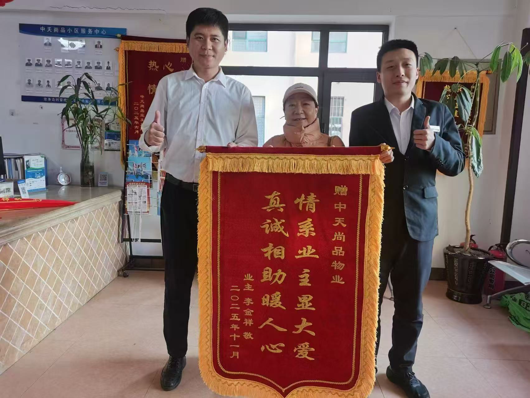 近日,一面繡有“情系業(yè)主顯大愛、真誠相助暖人心”的錦旗被1號樓業(yè)主李金祥的愛人鄭重送到中天尚品小區(qū)物業(yè)服務(wù)中心,以此感謝物業(yè)管家馮郅文、管家薛家旭、經(jīng)理孔祥宇三位物業(yè)人員長期以來風(fēng)雨無阻護(hù)送其殘疾家人回家的暖心之舉,錦旗上的鎏金大字,既是對物業(yè)工作的高度認(rèn)可,更是鄰里間溫情的生動(dòng)見證。李金祥業(yè)主因肢體殘疾,日常出行極為不便。物業(yè)辦公室三名員工在了解這一情況后,主動(dòng)提出每日定點(diǎn)接送的幫扶方案。無論酷暑嚴(yán)寒、刮風(fēng)下雨,他們總會(huì)準(zhǔn)時(shí)出現(xiàn)在小區(qū)單元門口等候,細(xì)致地協(xié)助其乘坐電梯、安全抵達(dá)家門口。過程中,他們不僅關(guān)注業(yè)主的出行安全,還時(shí)常主動(dòng)關(guān)心其身體狀況和生活需求,主動(dòng)幫忙拎取物品,用日復(fù)一日的堅(jiān)守與陪伴,為殘疾業(yè)主搭建起一條安全、溫暖的“回家路”?!?/span>他們?nèi)还ぷ魅藛T從來沒有一句怨言,每天都準(zhǔn)時(shí)等候,比我們自己家人還上心!”李金祥的愛人在送錦旗時(shí)動(dòng)情地說,正是物業(yè)員工這份不計(jì)回報(bào)的付出,讓他們?nèi)腋惺艿搅宋飿I(yè)的溫暖與關(guān)懷。中天尚品物業(yè)服務(wù)中心經(jīng)理孔祥宇表示,收到錦旗既是榮譽(yù)也是責(zé)任,物業(yè)服務(wù)的核心是“以人為本”,物業(yè)人員的行為正是物業(yè)團(tuán)隊(duì)踐行用心服務(wù)、用情守護(hù)理念的縮影。未來,物業(yè)將繼續(xù)關(guān)注特殊群體需求,完善便民服務(wù)舉措,用更細(xì)致、更貼心的服務(wù)搭建起與業(yè)主之間的“連心橋”,共同營造互助友愛、溫馨和諧的社區(qū)氛圍。